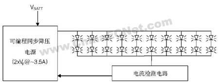 一个典型的LED前照灯应用要求给LED阵列提供大约25 瓦以上的功率。因为LED元件的一个优点是效率高,所以驱动电子元件也应该提高效率,以充分发挥LED技术的优势。因此考虑采用某种开关电源 (SMPS)来实现这个目标是可以的(参见图1)。但大多数SMPS 设计的目标是调节电压而不是电流。